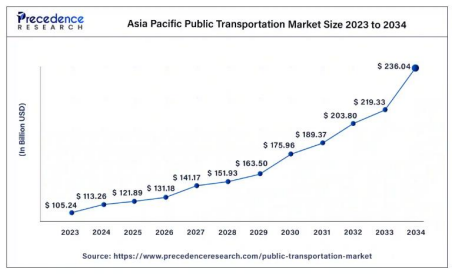 This is especially beneficial in cities like Jakarta, where the transportation system can become more efficient, akin to successful models in Seoul and Tokyo. The numbers tell the story. The Asia Pacific public transportation market was valued at USD 105.24 billion in 2023 and is projected to grow to USD 236.04 billion by 2034, with a CAGR of 7.66% from 2024 to 2034.